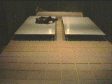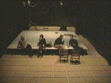 Der Künstler aus London bezieht seine Sound Projection "Rolling" auf die Leere der Bühne. Die beleuchteten aber unbesetzten Bühnenteile schaffen eine Stimmung der Erwartung auf den Auftritt des Schauspielers. Stattdessen folgen jedoch zwei kurze, aufgenommene Sounds, die durch die Platznahme eines Besuchers angeschaltet werden. Der eine intensiviert das Erwartungsgefühl, ähnlich wie das fine tuning eines Orchesters. Der andere, als Finale wenige Minuten später, hinterläßt eine große Stille, die dem Besucher dann erst ermöglicht, die üblichen Geräusche des Raumes wahrzunehmen. |